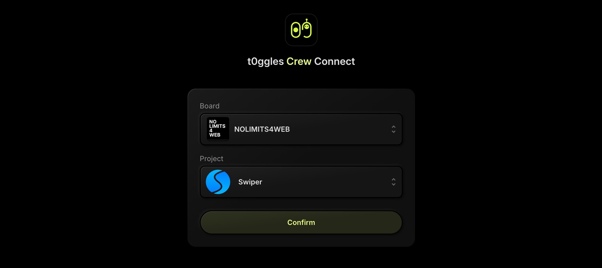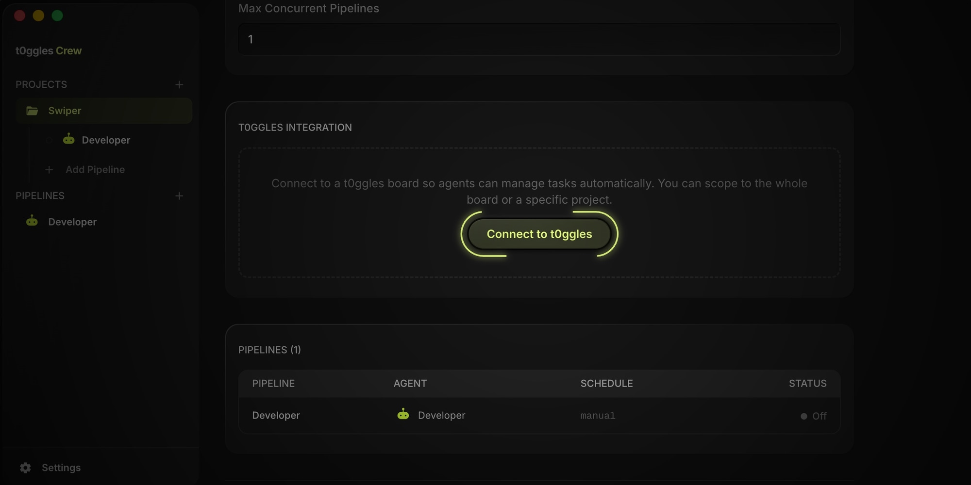 Open t0ggles Crew, create a project, and click "Connect to t0ggles."