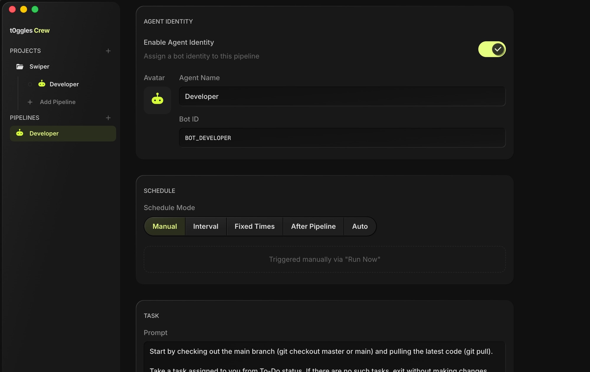Before creating pipelines, set up agent users on your board. Agent users are bot identities that represent your AI agents - you give each one a name (like "Claude Developer" or "Claude Reviewer") and pick a robot avatar. Once created, you can assign tasks to them just like any team member, and t0ggles Crew pipelines use these identities to interact with your board.