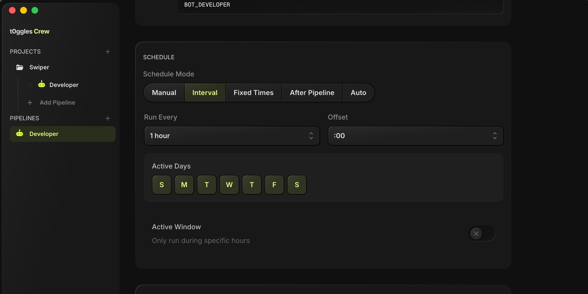 Five scheduling modes let you control exactly when agents work. Run them continuously during work hours, trigger them after another pipeline completes, or keep them manual for sensitive tasks.