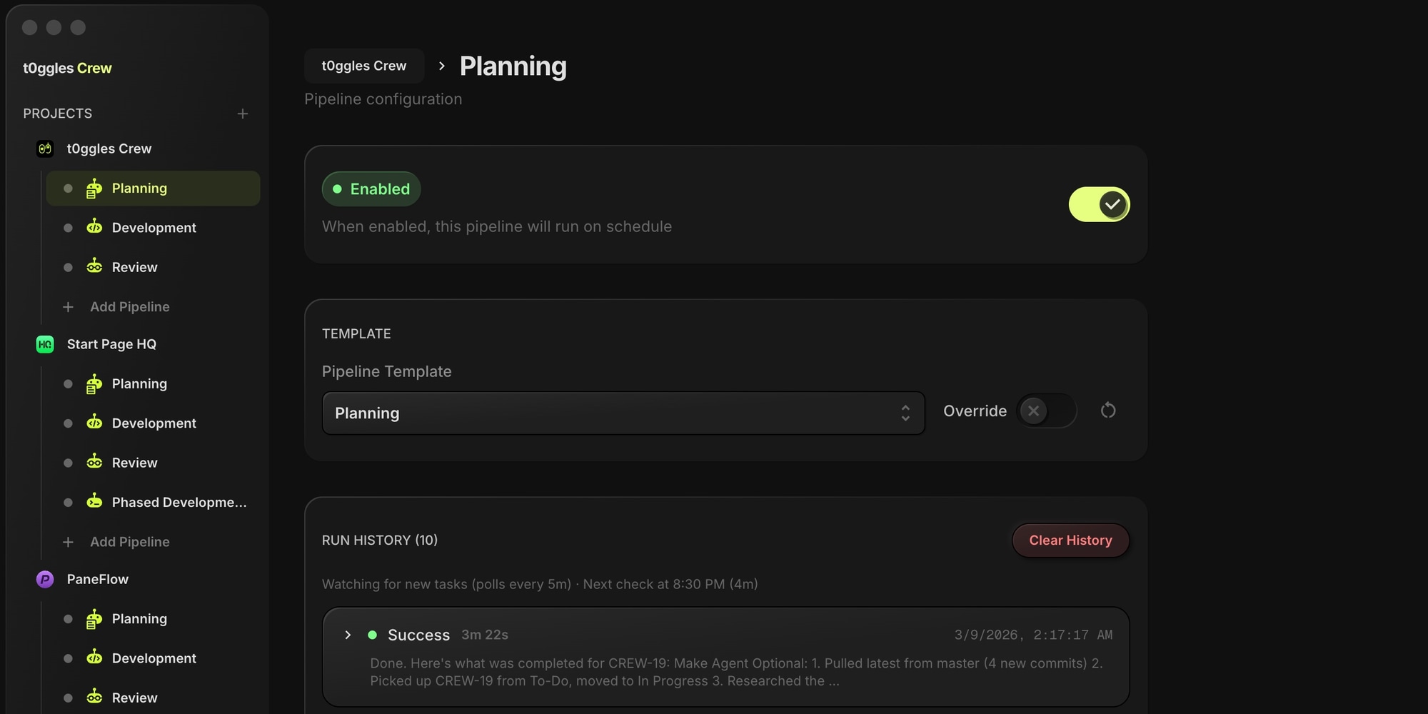 Monitor agent output in real time. t0ggles Crew streams terminal output live so you can see exactly what each agent is doing. Check run history, review logs, and catch issues early.