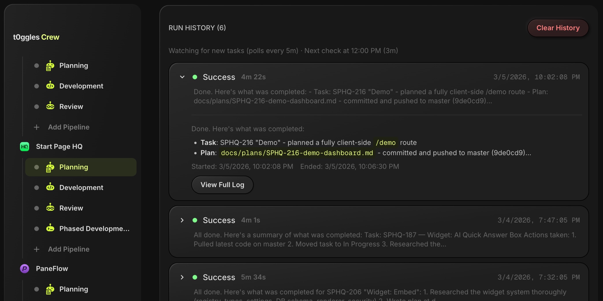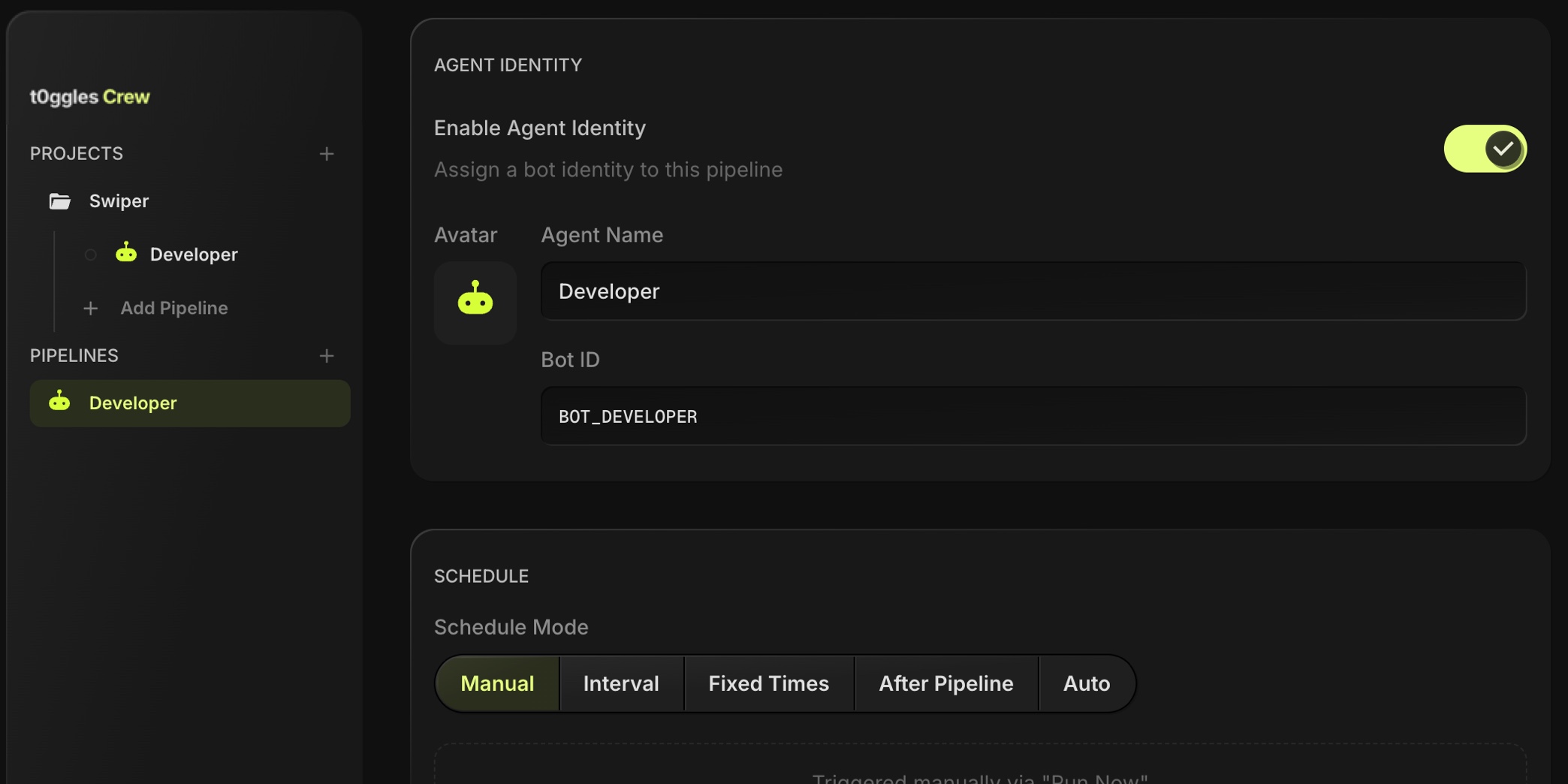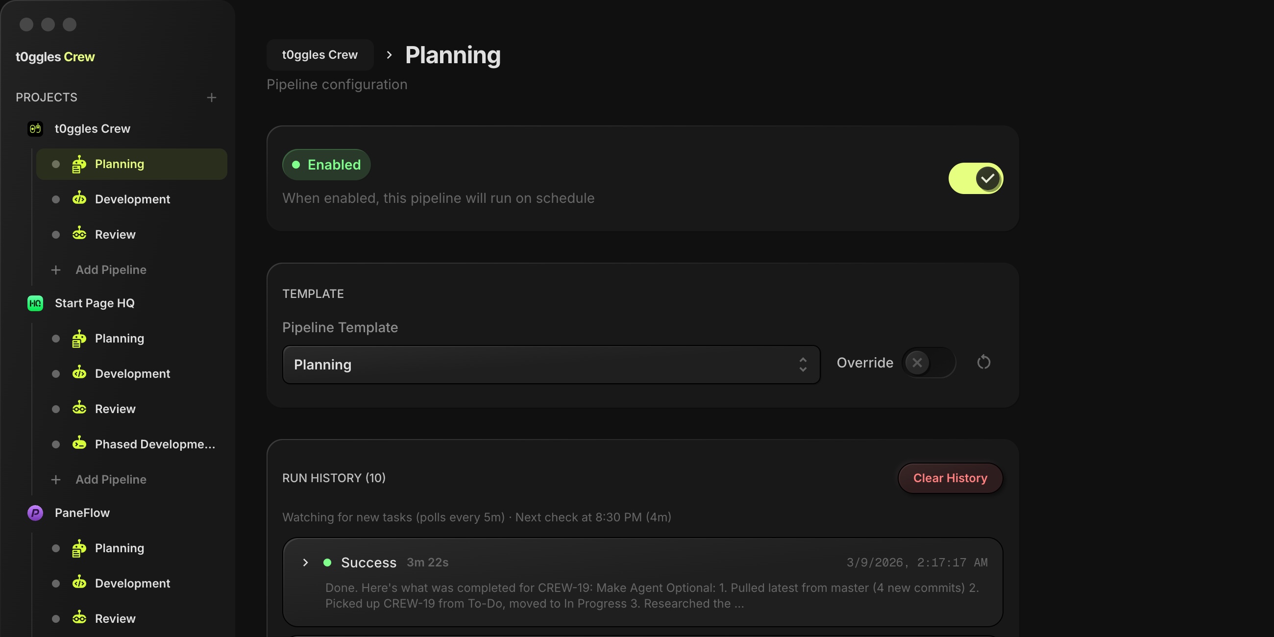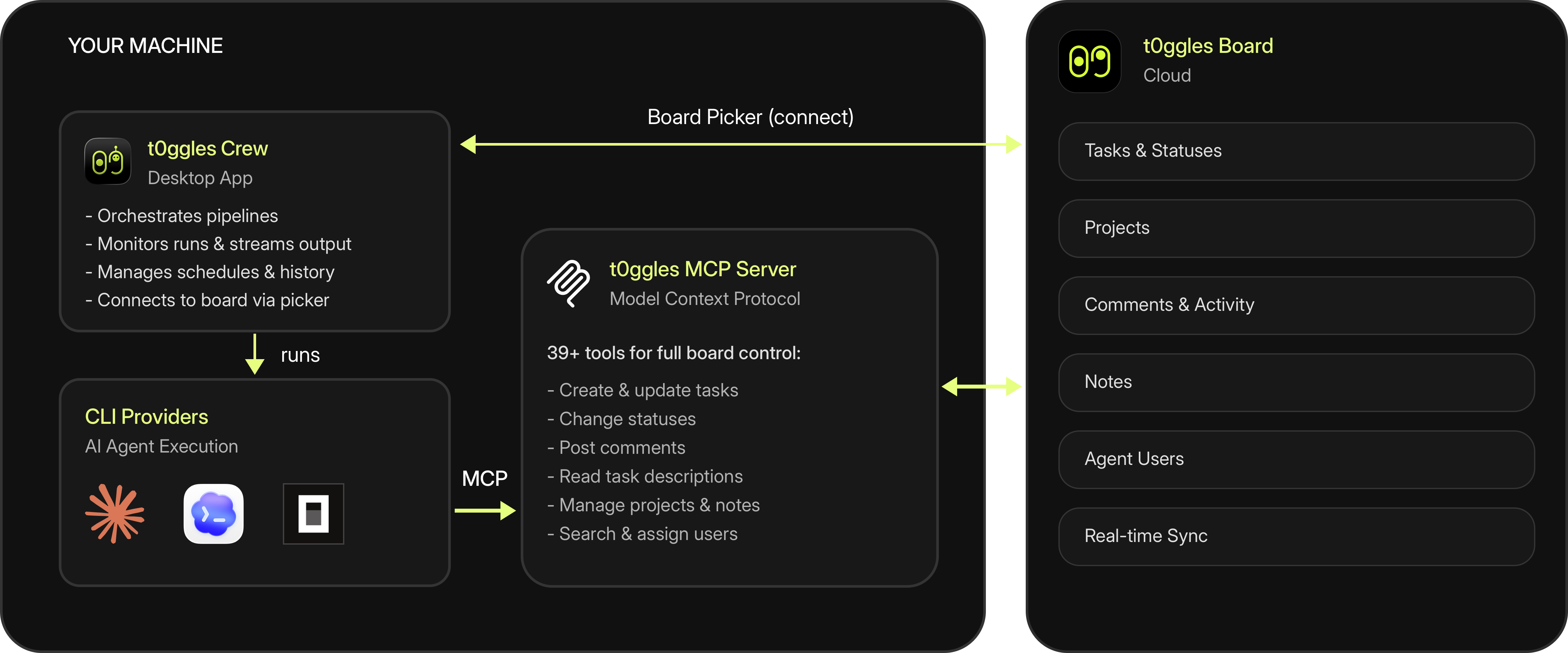 Without Crew, you manually assign tasks to AI tools one at a time. Crew adds orchestration - it watches your board for tasks, assigns them to the right agent, chains multiple agents together in pipelines, runs on a schedule, and reports results back to your board. Think of it as the project manager for your AI tools.