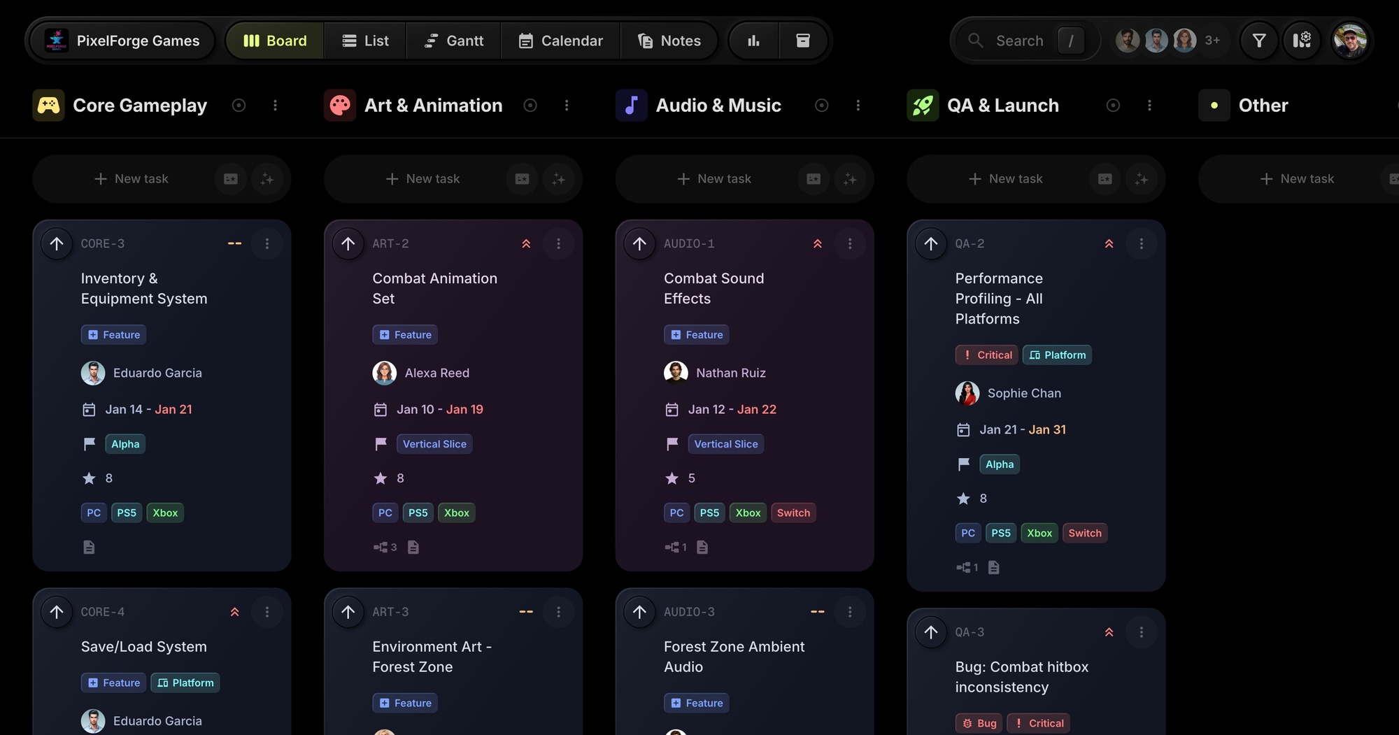 Game development teams struggle when work is scattered across Discord, spreadsheets, and email. Artists don't know what gameplay features are ready for assets. Audio waits on animations that aren't finished. QA finds bugs but can't track them properly.